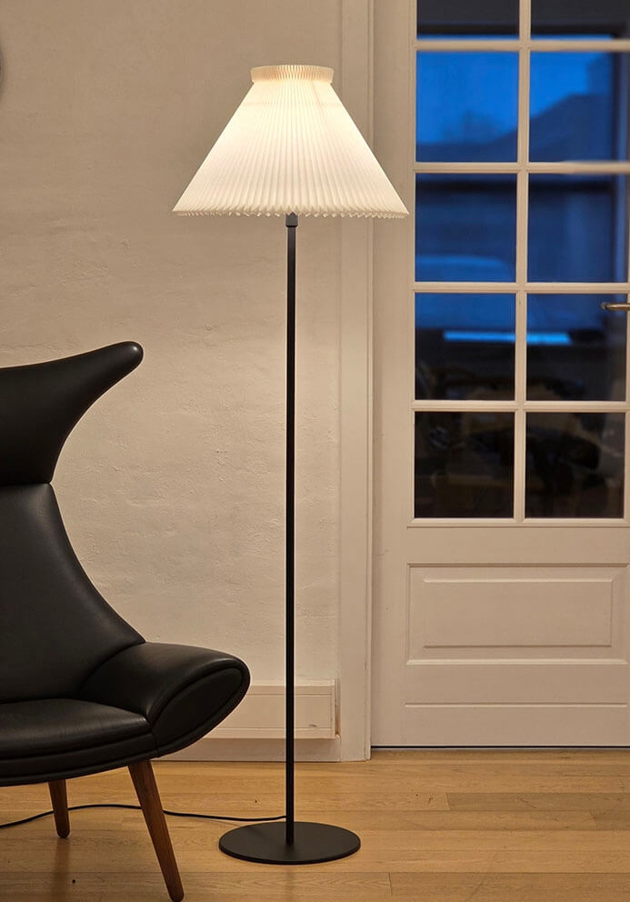 LE KLINTs 334 gulvlampe er klassisk og moderne design med et minimalistisk og tidløst udtryk. Lampen har et sortlakeret stel i stål kombineret med en håndfoldet LE KLINT lampeskærm af model 1 med en sidelængde fra underkant af kraven på 30 cm og en diameter 44 cm.