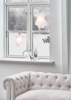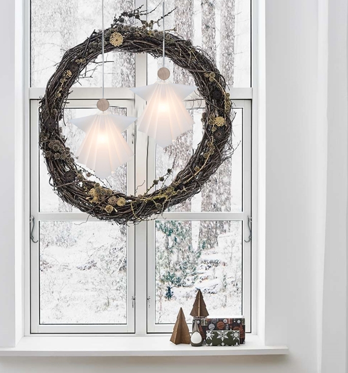 Englene skal være en påmindelse om, at vi i de mørke efterårs- og vintertider skal passe på hinanden. Lad endvidere den lysende engel i hjemmet skabe en varm atmosfære og smuk dekoration, hvor de gamle foldeteknikker er fastholdt i et stramt og enkelt design. Her oplever du samme kvalitetsmateriale og principper, som du kender fra LE KLINTs verdenskendte håndfoldede lampeskærme.
