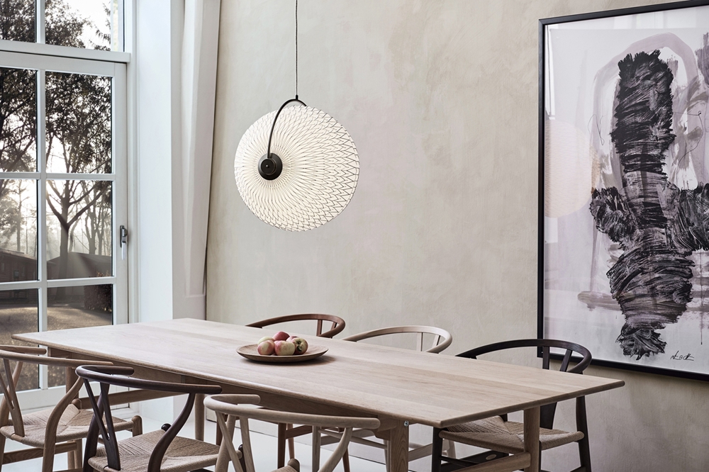 CALEO har LE KLINTS ikoniske foldearbejde i skærmen, men denne er vendt 90 grader, og plisserne er lavet på en ny måde.