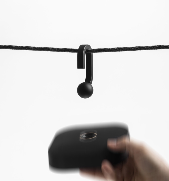 Dette er kun et Flai robe pendelophæng/tilbehør i sort. For at 'bygge' denne til en lampe - og for at få glæde af Flai lampernes funktionalitet med at omdanne lampen til forskellige lampetyper, skal der tilkøbes et Flai lampehoved, som findes i sort og hvid.